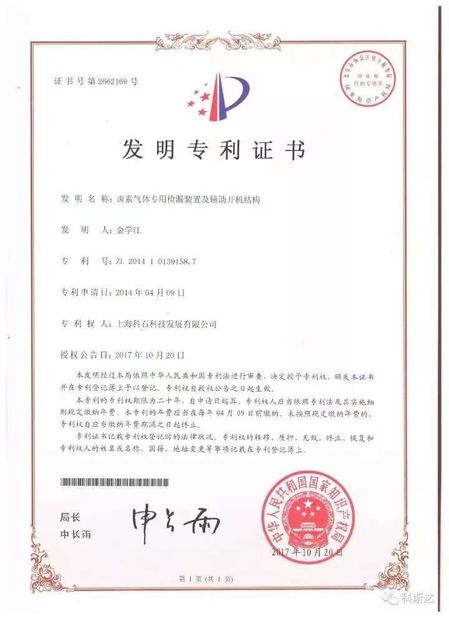 মান:Patent Certificate for Invention সংখ্যা:2662169 প্রদানের তারিখ:2017-10-20 প্রদান করেছেন:National Intellectual Property Administration, PRC |